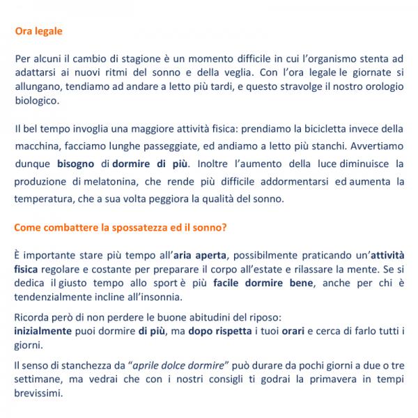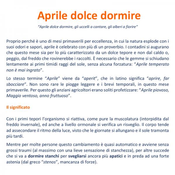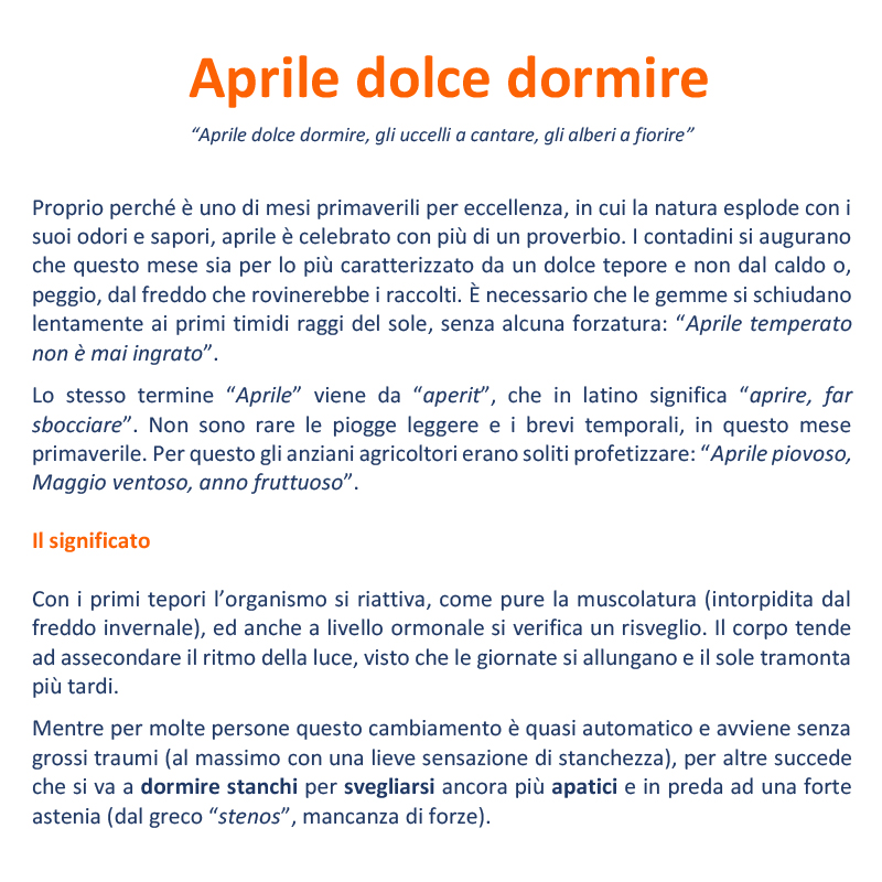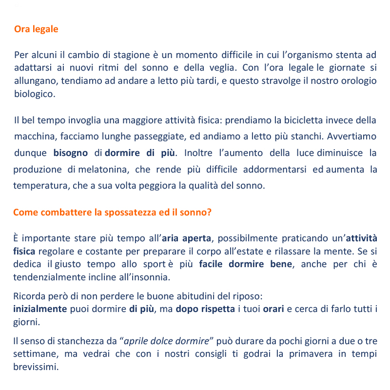 incline all’insonnia. Ricorda però di non perdere le buone abitudini del riposo: inizialmente puoi dormire di più, ma dopo rispetta i tuoi orari e cerca di farlo tutti i giorni. Il senso di stanchezza da “aprile dolce dormire” può durare da pochi